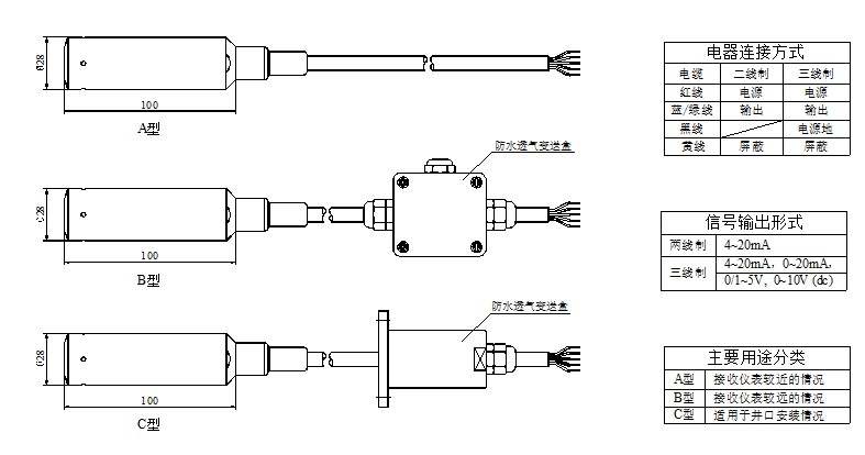 | 输出信号 | 4~20mA | 0/1~5V | 0~10V | |